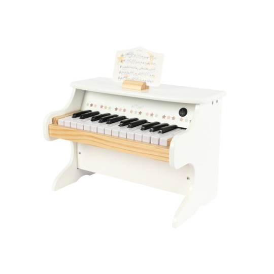 Detské drevené piano (elektrické) v kombinácii moderného bieleho odtieňa s prírodným drevom, zdobené hviezdami, premení každé dieťa na hudobnú hviezdu. Drevené detské klavíro po zapnutí vypínača a stlačení kláves vydáva krásne zvuky, zodpovedajúce skutočným tónom. Táto elektrická hudobná hračka prebúdza v deťoch lásku ku hudbe, stimuluje zmysly, rozvíja kreativitu a fantáziu.