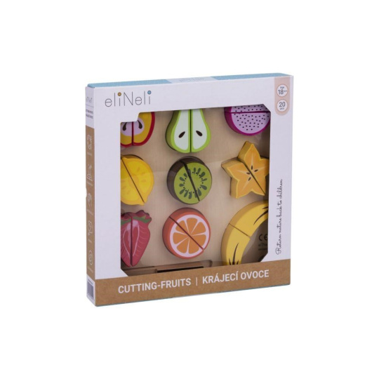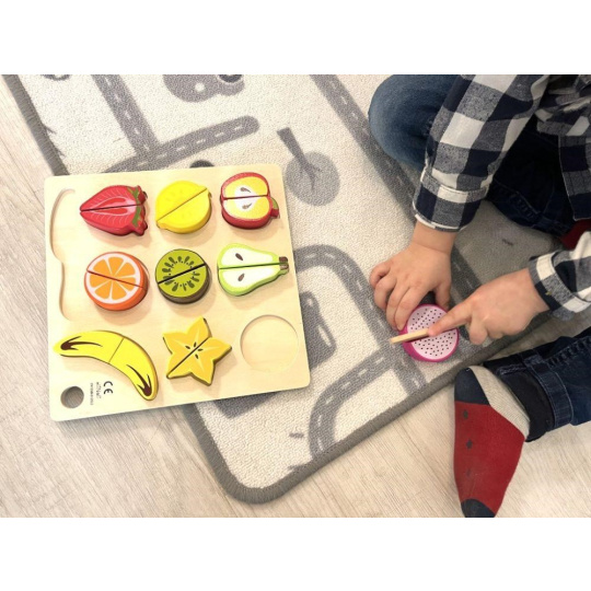 Drevené ovocie na krájanie je hračka, ktorá by nemala chýbať v žiadnej detskej kuchynke ani detskom obchode. Táto činnosť je pre deti úplne bezpečná. Polovice ovocia sú spojené suchým zipsom, vďaka čomu deti ľahko ovocie dreveným nožom rozrežú. Balenie obsahuje 9 druhov ovocia, drevenú doštičku aj drevený nôž.