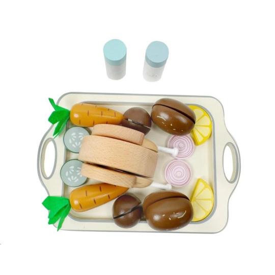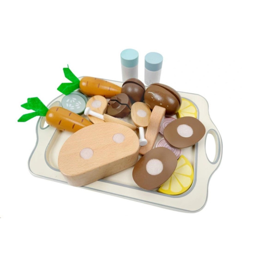 Drevená sada potravín so zeleninou, kurčaťom, solničkou, korením a veľkým podnosom (táckom) je skvelým doplnkom do detskej kuchynky. S touto sadou bude príprava (pečenie) kurčaťa hračkou a veľkou zábavou. Drevené kurča stačí obložiť obľúbenou zeleninou a prílohami, osoliť, okoreniť a vložiť do rúry, ktorá je súčasťou detskej kuchynky vašej dievčatko alebo chlapca. Teraz už len pohlídať, aby sa kurča nespálilo a chutné vyzerajúce jedlo je pripravené na podávanie. S touto originálnou sadou drevených potravín si deti vyskúšajú prípravu obeda bezpečným detským spôsobom, zdokonalia motorické zručnosti a manuálnu zručnosť, pustia uzdu svojej fantázii, pridajú sa do roly kuchára, mamičky, otecka a užijú si veľa zábavy. Na natieranie sa používajú vodou riediteľné farby, vhodné a bezpečné pre deti.