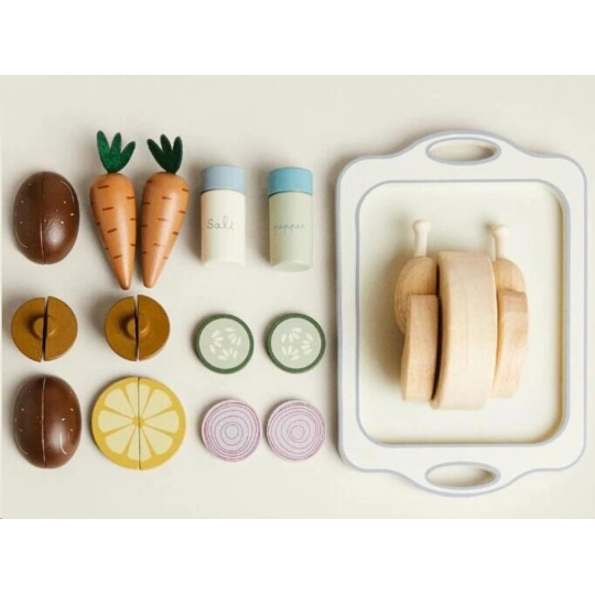 Drevené potraviny, zelenina, kurča, solnička s korením a veľký tác uľahčia deťom varenie a pečenie v detskej kuchynke. S touto drevenou sadou krájacích potravín bude pečenie kurčaťa zábavnou hrou. Stačí ku kurčaťu pridať obľúbenú zeleninu a potraviny, osoliť, okoreniť a vložiť kurča do rúry. Upečené drevené kurča s oblohou na drevenom podnose vyzerá naozaj chutne a je na zahryznutie.