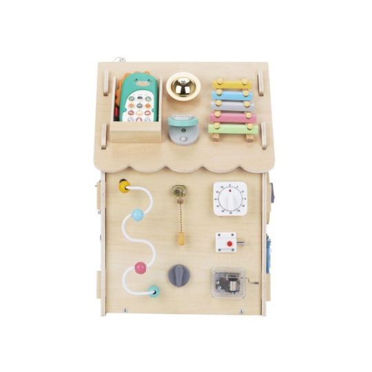 Domeček activity board v prírodnom (natur) prevedení, s montessori a hracími prvkami, s volantom a ďalšími zaujímavými doplnkami láka deti k preskúmaniu, ku hre a k učeniu sa. Drevený activity board domeček je hracou a zároveň výukovou pomôckou. Pri hre deti prirodzeným spôsobom zdokonaľujú svoje schopnosti, učia sa novým veciam a užijú si veľa zábavy.