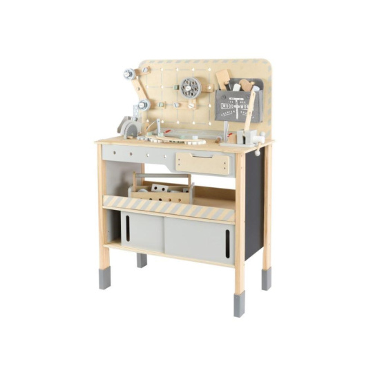 Detský drevený ponk XXL so veľa príslušenstva, skvelým jerábom a opaskom na náradie ZADARMO získa každého malého majstra. Detský ponk v kombinácii sivej farby s farbou prírodného dreva, s jerábom, náradím, skrutkami, doskami a hlavne so skvelým množstvom vychytávok rozvíja jemnú motoriku, manuálnu zručnosť, koordináciu očí a rúk, rozvíja kreativitu, učí deti sústrediť sa a trpezlivosti.