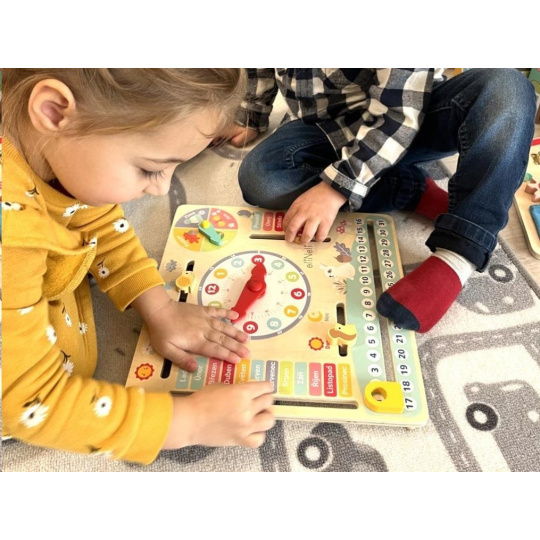 Dobyté kalendár v slovenčine je krásnou vzdelávacou hračkou aj jedinečnou dekoráciou do izbičky dievčat aj chlapcov. Detský kalendár v farebnej kombinácii prírodného dreva a krásnych farieb, s prírodnými motívmi a zvieratkami, prevedie deti celým kalendárnym rokom. Kalendár s lesnými zvieratkami pomôže deťom s orientáciou v čase. Pre deti je veľmi ťažké pochopiť a naučiť sa niečo, čo si nedokážu predstaviť. S detským kalendárom budú mať deti názorné ukážky, ako plynie deň, aké môže byť vonku počasie, ako sa striedajú ročné obdobia, ako idú jednotlivé dni a mesiace po sebe. Uprostred kalendára deti nájdu veľké farebné hodiny.