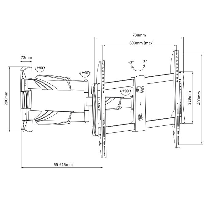 Držiak LED TV Fiber Mounts M8C33 Nástenný držiak na zavešenie televízie 37-70", otočný +/-90°, sklopný +10°/-15°, vzdialenosť TV od steny 55-615mm, korekcia roviny +/-3°, krytky na káble, VESA 200x100 až 600x400, nosnosť 35kg Kvalitný nástenný držiak robustnej veľmi pevnej konštrukcie, s ktorým nastavíte televíziu do polohy, ktorú potrebujete. Otáčanie do strán, náklon, dĺžkové nastavenie, korekcia roviny. Krytky na uchytenie všetkých káblov. Dodávame vrátane inštalačného materiálu. Výsuvný otočný a sklopný držiak TV 37-70" Fiber Mounts M8C33Kvalitný držiak na televízie na zavedenie na stenu a manipuláciu Fiber Mounts M8C33 Technické údaje: nosnosť 35kg podporuje VESA štandardy 200x100 až 600x400 ideálny na televízory s uhlopriečkou 37 - 70" nastavenie vzdialenosti od steny 55 mm až 615 mm otáčanie do strán +/- 90 ° náklon obrazovky hore až +10 ° a dole až -15 ° korekcia roviny +/- 3 ° kryty na uchytenie káblov veľmi spoľahlivá pevných konštrukcia ľahké polohovanie televízie farba čierna záruka 5 rokov Kvalitný a spoľahlivý pohyblivý držiak na televízie Fiber Mounts M8C33 Držiak TV Fiber M8C33 podporuje VESA štandardy: VESA 200x100 VESA 200x200 VESA 300x200 a 200x300 VESA 300x300 VESA 400x200 a 200x400 VESA 400x300 a 300x400 VESA 400x400 VESA 600x400 Držiak M8C33 je vhodný na všetky značky a typy televízorov, ktoré majú váhu do 35 kg a ktoré podporujú ktorýkoľvek zo vyššie uvedených VESA štandardov.