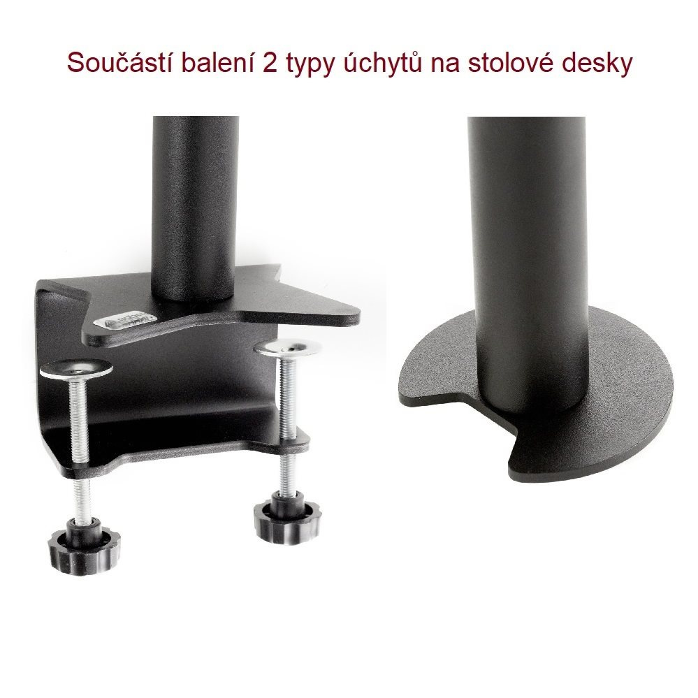 Profesionálny stolný držiak na 2 monitory EDBAK SV08 Profesionálny stolný držiak na zavedenie 2 monitorov 15-30" vertikálne, otočný, sklopný, výškovo nastaviteľný, farba čierna, VESA 75x75 a 100x100, nosnosť 20kg Profesionálny stolný držiak na nezávislé zavedenie monitorov alebo menších televízorov pod seba. Držiak umožňuje nezávislé nastavenie každého monitora - nastavenie výšky, náklonu a otočenia do strán. Dodávame vrátane 2 typov upevnenia na stolovú dosku (viď. obr. nižšie), farebné prevedenie čierne. Držiak je vyrobený z kvalitnej silnostennej ocele a neobsahuje žiadne plastové nosné prvky. Vďaka profesionálnej konštrukcii a výbornej kvalite je vhodný do akéhokoľvek prevádzky, kancelárie alebo pracovne. Stolný držiak do kancelárie na zavedenie 2 monitorov pod sebou - EDBAK SV08 Technické údaje: celkové maximálne zaťaženie 20kg maximálna hmotnosť každej obrazovky 10kg podpora VESA štandardu 75x75 a 100x100 odporúčame na monitory a obrazovky s uhlopriečkou 15" až 30" nezávislé výškové nastavenie každej obrazovky nezávislé otočenie do strán každej obrazovky nezávislé nastavenie sklonu každej obrazovky robustná oceľová konštrukcia bez nosných plastových častí funkcia pivot - možnosť otáčania obrazovky na výšku vhodný do akejkoľvek prevádzky dodávame vrátane 2 typov stolového upevnenia (viď. obr. nižšie) certifikát TUV GS farba čierna záruka 10 rokov Stolný držiak na 2 monitory alebo TV Edbak SV08 Držiaky na 2 monitory Edbak SV08 podporujú VESA štandardy: VESA 75x75 VESA 100x100