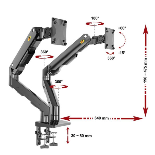 Stolný držiak na 2 monitory NB G55 Profesionálny stolný držiak na 2 monitory 24-34", nezávislé polohovanie každého ramena, otáčanie +/-180°, naklonenie +60°/-15°, nastavenie výšky 190-475mm, dĺžky na uchopenie 0-640mm, 1x USB, vedenie káblov, 2 stolové úchyty, VESA 75x75 a 100x100, nosnosť 2x16kg Stolný držiak na zavesenie 2 monitorov / TV / displejov s uhlopriečkou 24-34". Nezávislé nastavenie polohy každej obrazovky podľa potreby. Ramena majú plynový piest, ktorý je nutné nastaviť na hmotnosť zavedených obrazoviek od 5kg do 16kg. Výškovo polohovanie od 190mm do 475mm, otáčanie do strán +/- 180°, naklonenie +60°/-15°, nastavenie vzdialenosti od stolového uchytenia 0-640mm, funkcia pivot +/- 360°, podpora VESA 75x75 a 100x100 s možnosťou zakúpenia nadstavca na 100x200, 200x100 a 200x200. Dodávame vrátane 2 typov stolových úchytov na dosky 20-90mm: svorka na fixáciu na okraje stolov a skrutkový systém na fixáciu do priestoru stolovej dosky cez otvor 10-50mm. Systém na vedenie káblov. Inštalačný materiál. Farebné prevedenie čierna. Najvyššia kvalita. Záruka 5 rokov. Profesionálny stolný kancelársky držiak na 2 monitory NB G55 Technické údaje: nosnosť 32kg minimálna hmotnosť 1 obrazovky je 5kg a maximálna 16kg ramená majú plynový piest pre výškové polohovanie s nastavením na hmotnosť obrazovky ideálne na monitory a TV s uhlopriečkou 24-34" držiaky podporujú VESA štandardy 75x75 a 100x100 nezávislé polohovanie každého ramena otáčanie do strán +/- 180° naklonenie nadol až -15° a nahor až +60° nastavenie vzdialenosti od stolového uchytenia 0-640mm nastavenie výšky 190-475mm (+/-285mm) funkcia pivot: rotácia +/- 360° systém na vedenie káblov 1x USB port na stolovom uchytení 2 typy úchytov na (stolové) dosky 20-90mm: na okraj alebo do priestoru cez otvor 10-50mm najvyššia kvalita spracovania farba čierna záruka 5 rokov Profesionálny držiak na zavesenie dvoch monitorov na stôl NB G55 Držiak na 2 monitory NB G55 podporuje VESA štandardy: VESA 75x75 VESA 100x100 Držiak umožňuje jednoduché výškové polohovanie monitora od 190mm do 475mm vďaka plynovým piestom. Tie je nutné nastaviť na hmotnosť zavedeného monitora od 5kg do 16kg. Hmotnosť monitora nesmie byť nižšia ako 5kg, inak nebude možné meniť výšku, monitor by stále ostával v najvyššej polohe. Držiak na 2 monitory do kancelárie alebo pracovne NB G55 2 typy uchytenia na stoly / dosky: svorka s 2-bodovým fixovaním na dosky o sile 20-90mm skrutkový systém, fixácia k doske 20-90mm cez otvor 10-50mm 2 spôsoby uchytenia na stolové dosky NB G55 Držiaky NB G55 sú vhodné na: klasické rovné monitory prehnuté (curved) monitory širokouhlé monitory televízory All in One PC dotykové obrazovky - monitory aj televízory zobrazovacie panely s podporou VESA