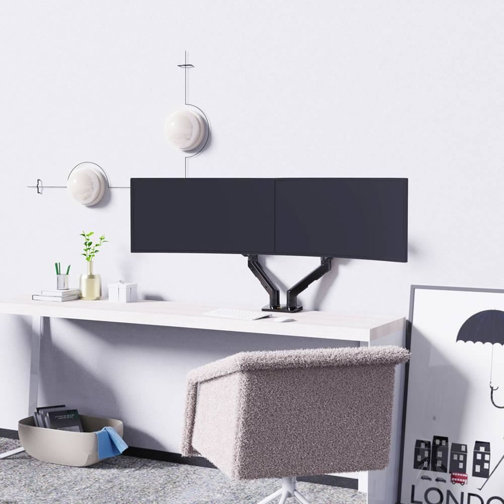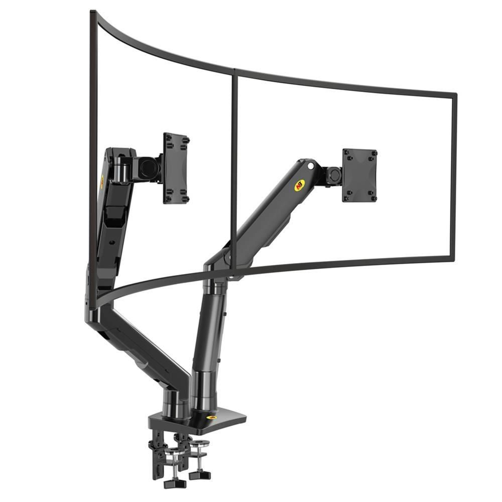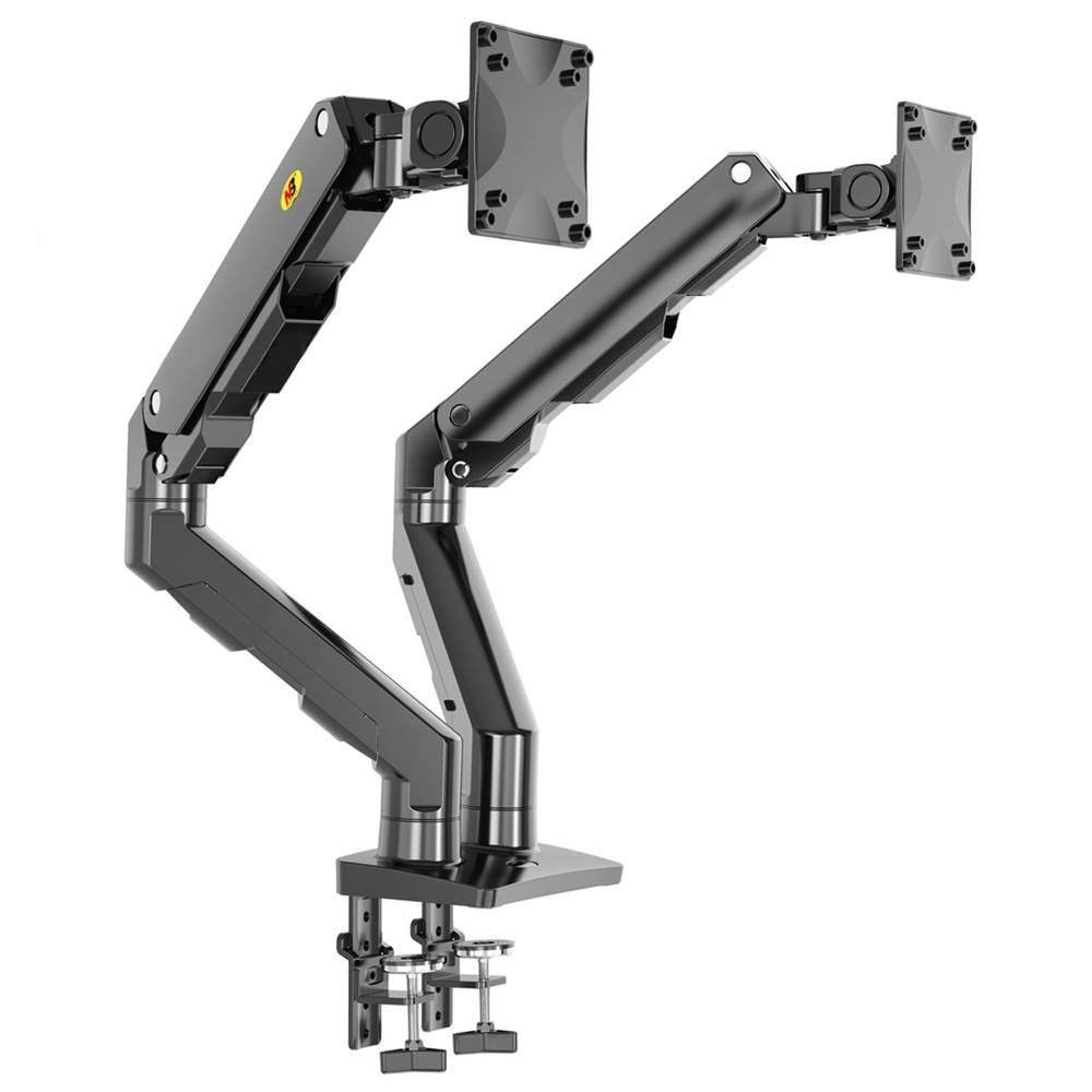 Stolný držiak na 2 monitory NB G55 Profesionálny stolný držiak na 2 monitory 24-34", nezávislé polohovanie každého ramena, otáčanie +/-180°, naklonenie +60°/-15°, nastavenie výšky 190-475mm, dĺžky na uchopenie 0-640mm, 1x USB, vedenie káblov, 2 stolové úchyty, VESA 75x75 a 100x100, nosnosť 2x16kg Stolný držiak na zavesenie 2 monitorov / TV / displejov s uhlopriečkou 24-34". Nezávislé nastavenie polohy každej obrazovky podľa potreby. Ramena majú plynový piest, ktorý je nutné nastaviť na hmotnosť zavedených obrazoviek od 5kg do 16kg. Výškovo polohovanie od 190mm do 475mm, otáčanie do strán +/- 180°, naklonenie +60°/-15°, nastavenie vzdialenosti od stolového uchytenia 0-640mm, funkcia pivot +/- 360°, podpora VESA 75x75 a 100x100 s možnosťou zakúpenia nadstavca na 100x200, 200x100 a 200x200. Dodávame vrátane 2 typov stolových úchytov na dosky 20-90mm: svorka na fixáciu na okraje stolov a skrutkový systém na fixáciu do priestoru stolovej dosky cez otvor 10-50mm. Systém na vedenie káblov. Inštalačný materiál. Farebné prevedenie čierna. Najvyššia kvalita. Záruka 5 rokov. Profesionálny stolný kancelársky držiak na 2 monitory NB G55 Technické údaje: nosnosť 32kg minimálna hmotnosť 1 obrazovky je 5kg a maximálna 16kg ramená majú plynový piest pre výškové polohovanie s nastavením na hmotnosť obrazovky ideálne na monitory a TV s uhlopriečkou 24-34" držiaky podporujú VESA štandardy 75x75 a 100x100 nezávislé polohovanie každého ramena otáčanie do strán +/- 180° naklonenie nadol až -15° a nahor až +60° nastavenie vzdialenosti od stolového uchytenia 0-640mm nastavenie výšky 190-475mm (+/-285mm) funkcia pivot: rotácia +/- 360° systém na vedenie káblov 1x USB port na stolovom uchytení 2 typy úchytov na (stolové) dosky 20-90mm: na okraj alebo do priestoru cez otvor 10-50mm najvyššia kvalita spracovania farba čierna záruka 5 rokov Profesionálny držiak na zavesenie dvoch monitorov na stôl NB G55 Držiak na 2 monitory NB G55 podporuje VESA štandardy: VESA 75x75 VESA 100x100 Držiak umožňuje jednoduché výškové polohovanie monitora od 190mm do 475mm vďaka plynovým piestom. Tie je nutné nastaviť na hmotnosť zavedeného monitora od 5kg do 16kg. Hmotnosť monitora nesmie byť nižšia ako 5kg, inak nebude možné meniť výšku, monitor by stále ostával v najvyššej polohe. Držiak na 2 monitory do kancelárie alebo pracovne NB G55 2 typy uchytenia na stoly / dosky: svorka s 2-bodovým fixovaním na dosky o sile 20-90mm skrutkový systém, fixácia k doske 20-90mm cez otvor 10-50mm 2 spôsoby uchytenia na stolové dosky NB G55 Držiaky NB G55 sú vhodné na: klasické rovné monitory prehnuté (curved) monitory širokouhlé monitory televízory All in One PC dotykové obrazovky - monitory aj televízory zobrazovacie panely s podporou VESA