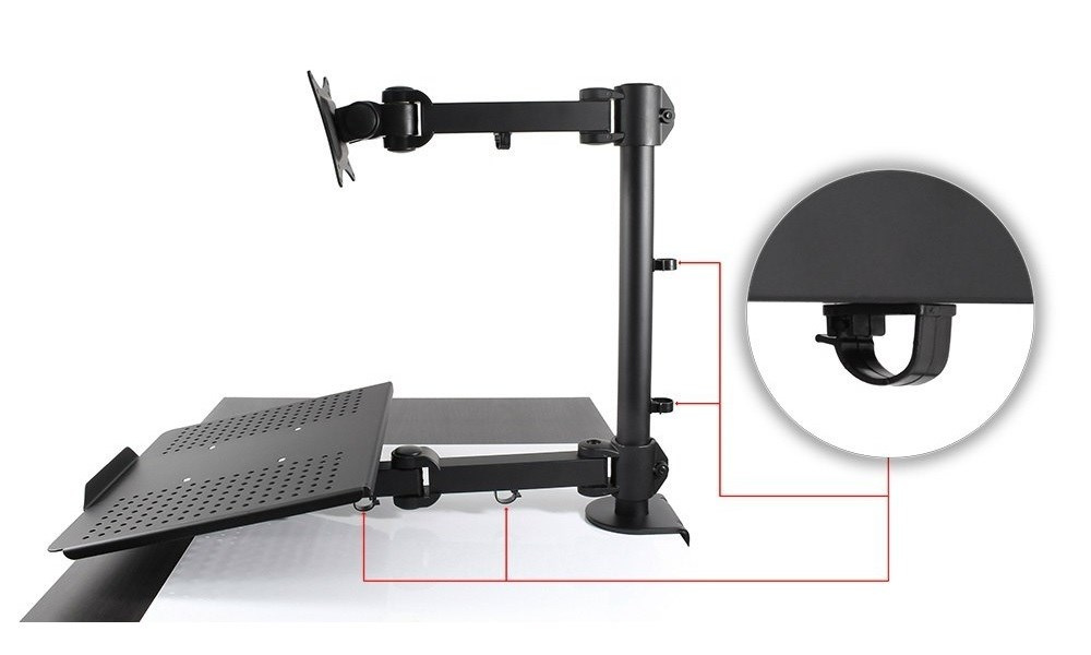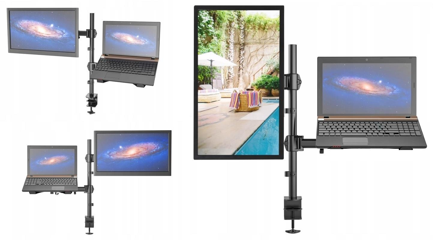 Držiak notebooku alebo laptopu a monitora Fiber Mounts FM23 Kvalitná zostava stolový držiak na monitor 15-27" a držiak na notebook laptop 13-17", polohovateľný, stabilný a pevný Vybavte si kanceláriu skvelým pomocníkom, ktorý vám ušetrí veľa miesta a zlepší ergonómiu pri práci. Zostava Fiber Mounts FM23 obsahuje držiak na monitory 15-27" a držiak na notebooky alebo laptopy s uhlopriečkou 13-17". Držiak monitora podporuje VESA 75x75 a 100x100, je možné ho otáčať do strán, nakláňať, rotovať a výškovo polohovať. Držiak notebooku je možné otáčať do strán a výškovo polohovať. Farebné prevedenie čierne, celková nosnosť 20kg, celokovová konštrukcia. Stolový držiak na monitor a notebook do vašej kancelárie - Fiber Mounts FM23 Technické údaje: nosnosť 20kg na monitory 15-27" na notebooky 13-17" VESA štandard 75x75 a 100x100 otáčanie do strán +/- 135° nakláňanie monitora +/- 90° upevnenie na stolovú dosku s hrúbkou 10-100mm farba čierna záručná doba 3 roky Stolový držiak na monitor a notebook do vašej kancelárie - Fiber Mounts FM23 Držiak na monitory podporuje štandardy VESA: VESA 75x75 VESA 100x100
