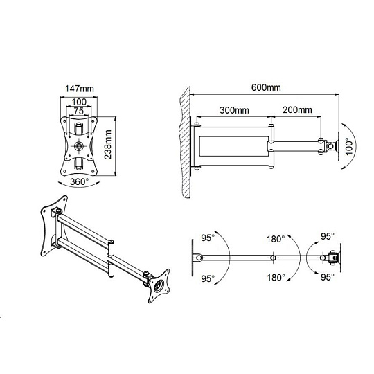 Kompletná špecifikácia Držiak TV alebo monitoru EDBAK GD26 Profesionálny držák na televízor alebo monitor 15-43", otočný, sklopný, dĺžkovo nastaviteľný, funkcia pivot, VESA 75x75 a 100x100, nosnosť 15kg Nástenný držák vynikajúcej kvality a robustnej konštrukcie pre zavesenie televízora alebo monitoru 15-43". Držiak podporuje VESA štandardy 75x75 a 100x100, je možné zakúpiť VESA rozšírenie na 200x100 a 200x200. Po zavedení TV na držiak môžete obrazovku otáčať na obidve strany aj kolmo ku stene, naklápať nahor a nadol, otočiť ju na šírku alebo na výšku. Vzdialenosť od steny je možné nastaviť v rozmedzí 90-600mm. Držiaky GD26 je možné zakúpiť vo troch farebných variantoch: čierny, strieborný alebo biely. Nosnosť držiaku je 15kg. Záruka 5 rokov. Polohovateľný otočný sklopný a dĺžkovo nastaviteľný držiak na LCD LED televízory a monitory - EDBAK GD26 / drzakyastolky.cz Technické údaje: nosnosť 15kg podporuje VESA štandardy 75x75 a 100x100 možnosť rozšírenia VESA štandardu na 200x100 alebo 200x200 za príplatok odporúčaná uhlopriečka televízora alebo monitora 15-43" nastaviteľná vzdialenosť od steny minimálna vzdialenosť 90mm maximálna vzdialenosť 600mm funkcia PIVOT - možnosť otáčania obrazovky okolo osi otáčanie do strán +/- 90° náklon +10° až -50° (možno aj obrátene, podľa montáže držiaka) jednoduchá a rýchla montáž profesionálna kvalita oceliová konštrukcia farba - čierna, strieborná alebo biela záruka 5 rokov