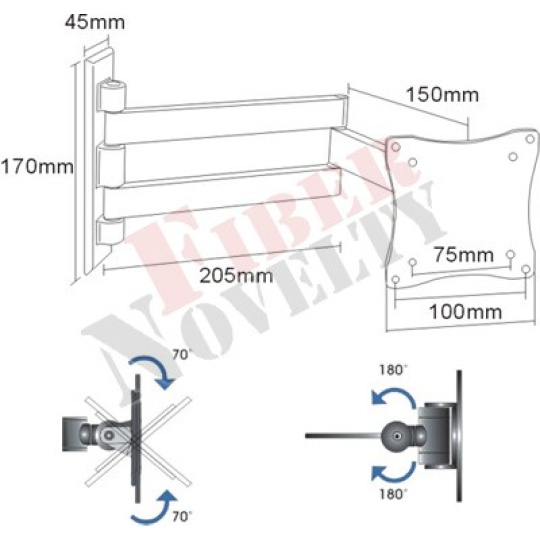 Držiak na televízory a monitory Fiber Novelty FN101 Kvalitný otočný držiak na monitor alebo menšiu televíziu do 32", možnosť veľkého náklonu, nastaviteľná vzdialenosť od steny Kvalitný televízny držiak na monitory a menšie televízory. Pri držiaku je veľmi jednoduchá montáž, pretože je dodávaný už zložený a nastavenie obrazovky do požadovanej polohy je otázkou sekúnd. Tento držiak na monitory má výborné riešenie sklonu, nevznikajú žiadne vôle a náklon je možný nahor aj nadol v úžasných až 70 stupňov. Držiak FN101 unesie záťaž až 15 kg a odporúčame ho pre obrazovky s uhlopriečkou do 32". Nástenná konzola na zavešenie lcd led obrazoviek, otáčanie do strán, náklon, zmena vzdialenosti od steny - Fiber Novelty FN101 Technické údaje: max. zaťaženie 15kg podporuje VESA štandard 75x75 a 100x100 odporúčame na monitory alebo menšie televízory s uhlopriečkou 15" až 32" možnosť náklonu až +/- 70° otočný do strán +/- 90° minimálna vzdialenosť obrazovky od steny 50mm maximálna vzdialenosť obrazovky od steny 370mm kvalitná konštrukcia z hliníka jednoduché nastavenie obrazovky do požadovanej polohy montážny materiál súčasťou balenia záruka 5 rokov Držiak Fiber Novelty FN101 podporuje VESA štandardy: VESA 75x75 VESA 100x100 Držiaky Fiber Novelty FN101 sú vhodné na všetky typy televízorov a monitorov, ktoré podporujú VESA štandard 75x75 alebo 100x100 a ich hmotnosť je maximálne 15kg. Na veľkosti uhlopriečky nezáleží, je možné zaviesť ako väčšie, tak aj menšie obrazovky.