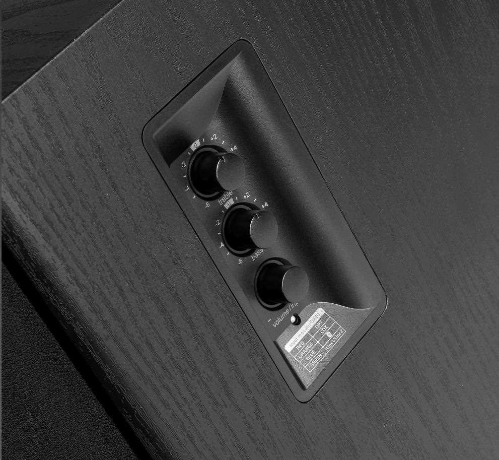 Na bočnom paneli nájdete tlačidlá na nastavenie výšok a basov, ktoré potrebujete na nastavenie reproduktorov presne tak, ako ich chcete, a navyše na prednej strane skrine nájdete kalibrovaný reflexný basový port. Systém zosilňovača triedy D s digitálnym spracovaním signálu a technológiou elektronického ovládania tónu vám poskytne extra hudobný zážitok.