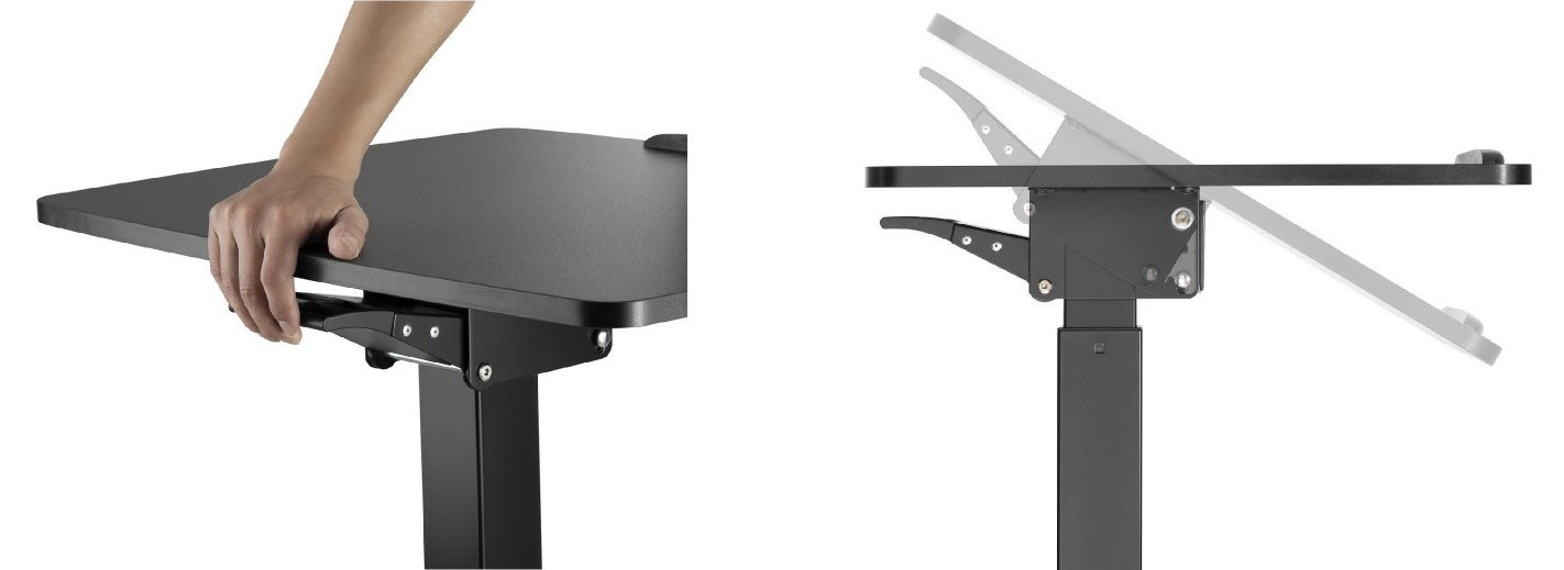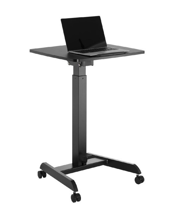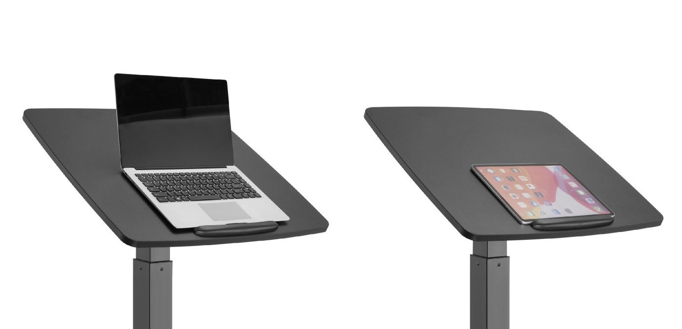 Stôl na notebook, laptop alebo projektor Fiber Mounts M8C92 výškovo nastaviteľný stôl na notebook, laptop alebo projektor, nakloniteľná pracovná doska 60*56cm s zabrzdou, nosnosť 8kg, pojazdové kolieska s brzdou Veľmi kvalitný a zároveň aj pekný pracovný stôl na notebooky alebo laptopy s možnosťou elektrického výšku nastavovania na prácu v sede alebo aj v stoji. Výškové nastavenie 758mm až 1128mm, tichý a rýchly chod, ovládanie nožnou pákou. Stôl je možné použiť aj na projektory a dataprojektory. Možnosť jednoduchého premiestnenia vďaka pojazdovým kolieskam s aretáciou. Pracovná doska je možné manuálne nakloniť z vodorovnej polohy až o 30°, rozmer pracovnej dosky je 600*560mm. Kvalitný povrchový povrch v decentnej čiernej farbe. Ideálny stôl do kancelárií aj domácností. Pracovný stolík do kancelárie alebo domácnosti, elektrické výškové polohovanie na prácu v sede alebo v stoji, na notebooky, laptopy alebo projektory Fiber Mounts M8C92Pracovný stolík do domácnosti alebo kancelárie Fiber Mounts M8C92 Technické údaje: nosnosť pracovnej dosky 8kg rozmerná pracovná doska 600x560mm elektrické nastavenie výšky stola 758-1128mm nožným pedálom tichý a rýchly chod možnosť manuálneho naklonenia pracovnej dosky 0° až -30° vynikajúca pevná konštrukcia kvalitný povrchový povrch v čiernom vyhotovení design vhodný ako do kancelárií tak aj do domácností možnosť práce na notebooku v sede alebo v stoji pojazdové kolieska s aretáciou záruka 2 roky