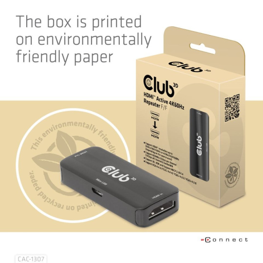 Club 3D CAC-1307 HDMI™ Active 4K60Hz Repeater predlžuje dĺžku akéhokoľvek HDMI™ kábla regeneráciou signálu HDMI™ pred odoslaním výstupov do monitora alebo projektora HDMI™. Aktivný opakovač HDMI™ odstráni digitálny šum (iskrenie) vo vašom obraze. Vstup aktívneho opakovača HDMI™ je pripojený pomocou dlhého kábla HDMI™ (samec samec) zo zariadenia HDMI™, ako je DVD prehrávač alebo satelitný set-top box s výstupným portom HDMI™. Výstup aktívneho opakovača HDMI™ je pripojený k druhému kábli HDMI™ (samec samec) na prechod z výstupu na akýkoľvek displej alebo projektor HDMI™ s konektorom HDMI™. Jednotka je umiestnená čo najbližšie k displeju (max. vzdialenosť 5 m/16,4 stopy), aby sa odstránil akýkoľvek šum spôsobený dlhým kábla HDMI™.