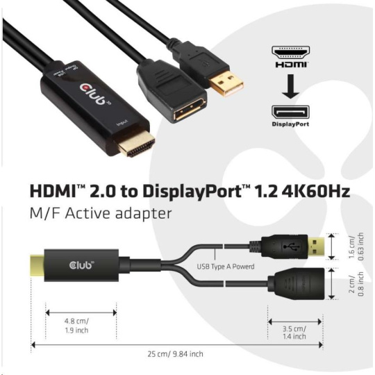 Club 3D CAC-1331 je HDMI™ na DisplayPort™ 1.2 Aktívny adaptér, ktorý umožňuje prenášať signál HDMI™ na signál DisplayPort™. Tento produkt podporuje DP1.2 s rozlíšením až 4096 x 2160@60 Hz. Okrem toho je vybavený portom USB typu A na napájanie v prípade, že zdroj HDMI™ nemá dostatok energie. Tento adaptér je jednosmerný.