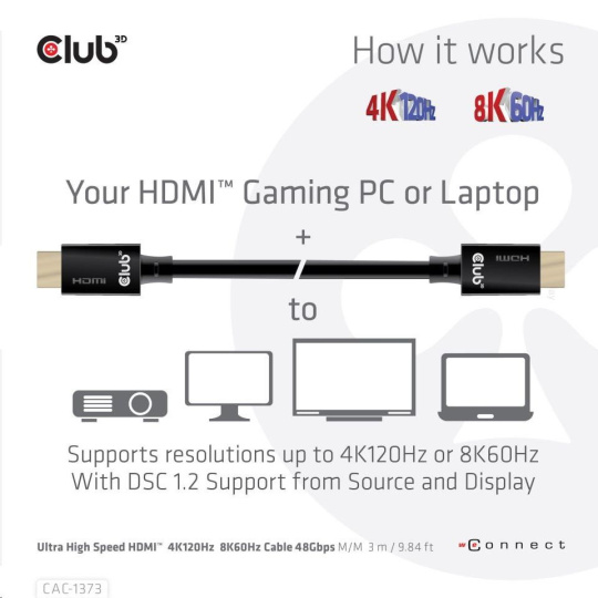 CAC-1373 - Ultra vysokorýchlostný HDMI™ kábel Club 3D je skonštruovaný tak, aby zvládol najvyššiu kvalitu video a audio signálov. HDMI™ má zvýšenú šírku pásma 48 Gb/s. Zvýšenie maximálnej šírky pásma v porovnaní s predchádzajúcimi verziami sa dosiahlo zvýšením prenosovej rýchlosti dátových kanálov (zo 6 Gb/s na 12 Gb/s) a počtu kanálov (z 3 na 4). To umožňuje podporu rozlíšení až do 10K pri 120 Hz!
