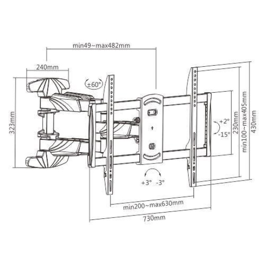 Profesionálny otočný držiak na televízory Fiber Super-3    Držiak na televízory 43-75", otáčanie do strán +/-60°, naklápanie +2°/-15°, korekcia roviny +/-3°, vzdialenosť Tv od steny 49-482mm, vedenie káblov, VESA 200x100 až 600x400, nosnosť 45kg    Nástenný držiak vynikajúcej profesionálnej kvality a v krásnom dizajnovom prevedení, ktorý je ideálny na zavešenie televízie s uhlopriečkou 43" až 75". Držiak Vám umožní s televízorom otáčať na obe strany až o 60°, nakloniť ho hore +2° alebo dole až o -15°, upraviť jeho rovinu o +/-3° a meniť vzdialenosť od steny od 49mm až do 482mm. Držiak podporuje VESA štandardy pre zavešenie Tv 200x100 až 600x400 a zvláda maximálnu hmotnosť až 45kg. Celá konštrukcia je oceľová, nástenný úchyt a ramená držiaku sú opatrené dizajnovými krytmi so systémom pre vedenie káblov. V balení nájdete inštalačný materiál. Farebné prevedenie čierne, o kvalite a spoľahlivosti držiaka svedčí aj poskytovaná záruka 10 rokov.     Profesionálny nástenný držiak na televízory Fiber Super-3     Technické údaje:   nosnosť 45kg na televízory a monitory s uhlopriečkou 43" až 75" podporované veľkosti VESA štandardov 200x100 až 600x400 otáčanie televízora do strán +/- 60° naklápanie televízora nahor +2° a nadol až -15° nastavenie vzdialenosti od steny 49mm až 482mm korekcia roviny obrazovky +/- 3° dizajnové kryty so systémom pre vedenie káblov oceľová konštrukcia ľahká montáž a polohovanie televízora inštalačný materiál farebné prevedenie čierne záruka 10 rokov    Ramená držiaka Fiber Super-3 sú opatrené dizajnovými krytmi so systémom pre vedenie káblov     Držiak Tv Fiber Super-3 podporuje VESA štandardy:  VESA 200x100 VESA 200x200 VESA 300x200 a 200x300 VESA 300x300 VESA 400x200 a 200x400 VESA 400x300 a 300x400 VESA 400x400 VESA 600x400    Na držiak Fiber Super-3 môžete zavesiť všetky typy a značky Tv aj monitorov, ktoré:   majú maximálnu hmotnosť 45kg podporujú ktorýkoľvek z vyššie uvedených VESA štandardov