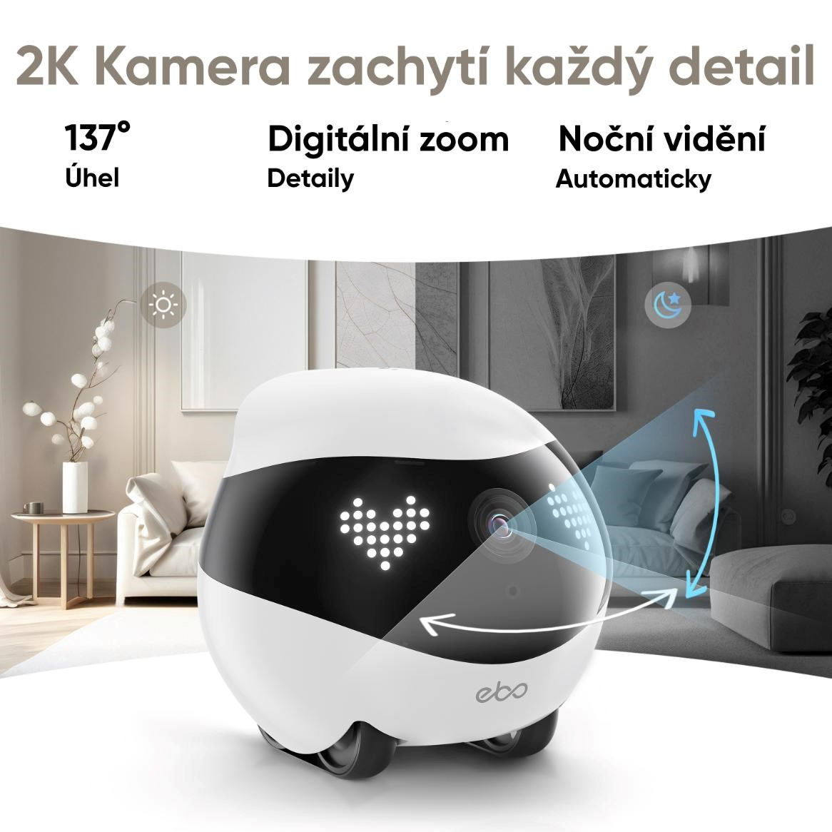 - 2K kamera s širokým uhlom záberu – zabezpečuje jasný a detailný obraz, ideálny na kontrolu domácnosti, detí alebo maznáčikov.