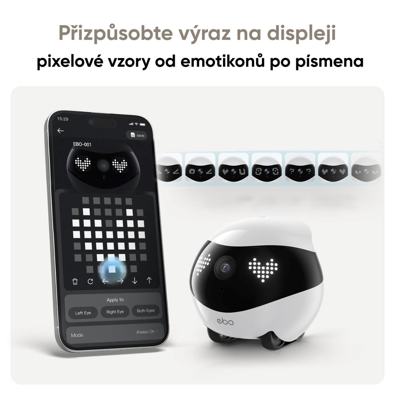 - Pixelové oči s animáciami – štýlový pixelový displej nahrádza oči a dodáva robotovi priateľský, hravý výraz.