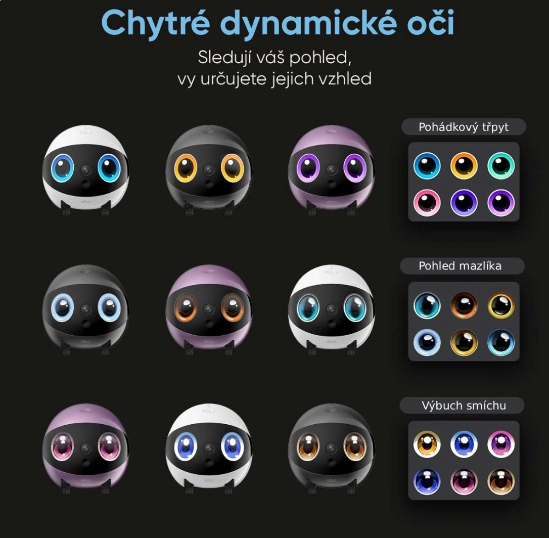 • Chytré dynamické oči – dva displeje s nastaviteľnými farbami a animáciami dodávajú robotovi osobnosť a priateľský vzhľad