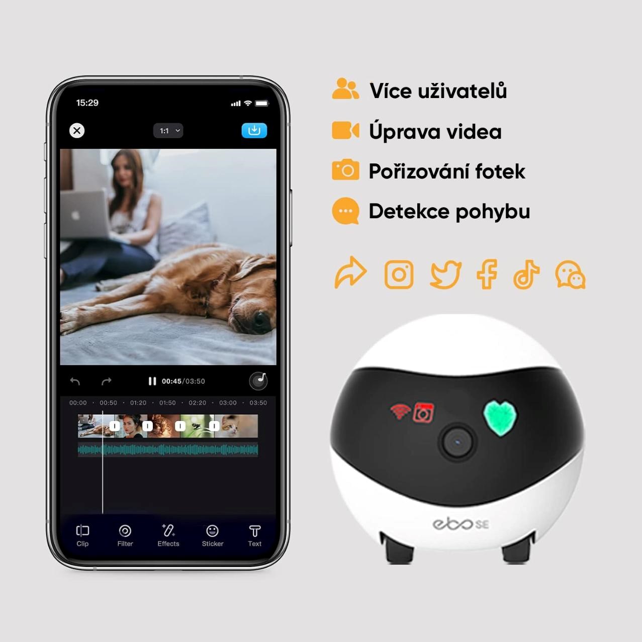 - Zábava pre domácich miláčikov aj deti – EBO SE reaguje na pohyb, s ním môžete hrať hry alebo sa môže stať „spoločníkom na diaľku“.