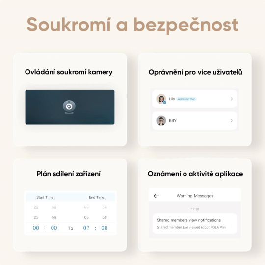 ROLA Mini dokáže nielen baviť, ale aj strážiť. Sleduje pohyb a nezvyčajné zvuky a pošle vám upozornenie priamo do telefónu. Môže tak fungovať ako mobilný domáci strážca, ktorý ponúka oveľa viac než bežná statická IP kamera. Či už chcete baviť svojho psa alebo mačku, alebo sa pozrieť, ako sa darí deťom doma, ROLA Mini vám umožní byť vždy na dosah – odkiaľkoľvek.
