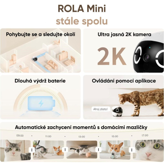 ROLA Mini nie je len kamera, ale interaktívny kamarát, ktorý pomáha zvieratám prekonať samotu a nudu, keď ste preč. Pohyb, zvuk i možnosť reagovať na váš hlas stimulujú prirodzenú zvedavosť a aktivitu zvieraťa. Robot dokáže miláčika baviť, upokojiť aj zaujať, čím prispieva k jeho duševnej pohode a lepšiemu správaniu počas vašej neprítomnosti.