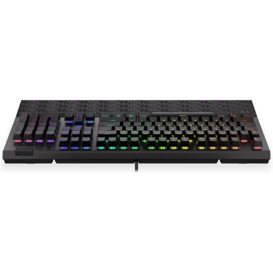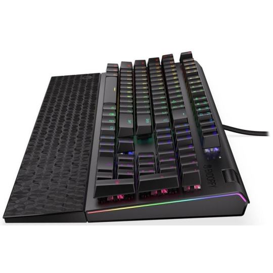Plnohodnotná mechanická klávesnica pre každého vášnivého hráča. Vďaka spínačom Kailh Blue ponúka výbornú odozvu a výdrž pres 50 miliónov stlačení. Konštrukcia z hliníku vykazuje iba tú najvyššiu možnú odolnosť a stabilitu. Špičkové pohodlie zabezpečí odnímatelná opierka dlaní. Klávesy sú RGB podsvietené a ponúkajú možnosť vlastného nastavenia. Navyše sú aj plne programovateľné, vďaka čomu môžete klávesnicu individualizovať presne podľa potrieb hráča a hrané hry. Klávesnica disponuje tiež otočným ovládačom hlasitosti. Samozrejme nechýba ani funkcia Anti-Ghosting a N-Key rollover. Pripojenie je realizované skrze odnímateľný USB kábel.