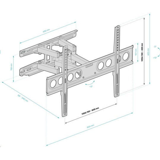 Nastavenie do požadovaného uhla si nevyžaduje uvoľnenie ani opätovné utiahnutie skrutiek (stačí uchopiť okraje televízora a nastaviť uhol)