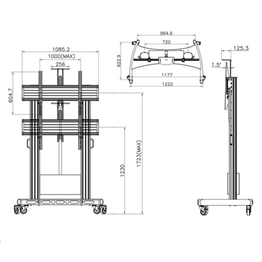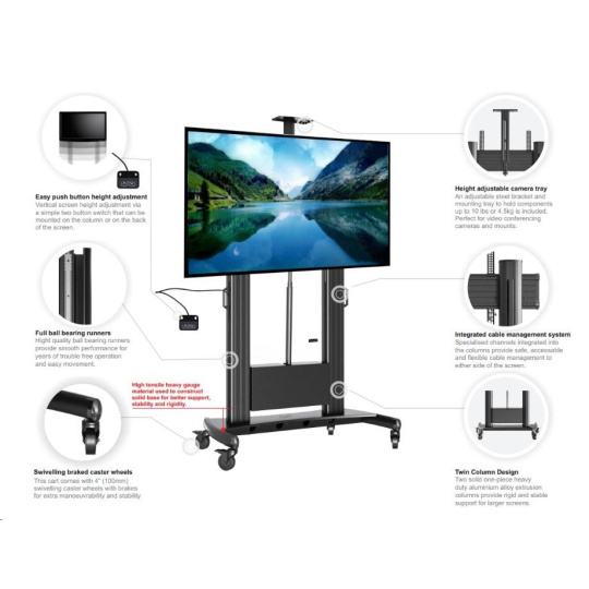 Technické údaje: •nosnosť 50kg •VESA štandard držiaku na TV 100x100 až 740x460 •nastaviteľná výška televízie 130cm až 195cm (výška po stred TV) •náklon obrazovky nahor až 6,5° a nadol až 12° •možnosť zakúpenia police na príslušenstvo •možnosť zakúpenia priečok na katalógy •systém vedenia kabeláže telom nosníka •kvalitné pojazdové kolieska s brzdou (možnosť zakúpenia nepojazdnej verzie bez koliesok) •výborná stabilita a bezpečnosť •certifikát TUV GS •záručná doba 10 rokov