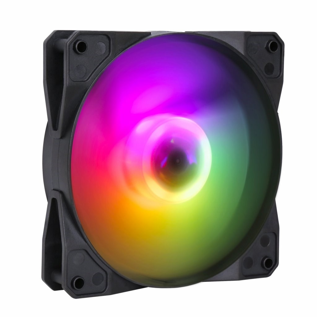 ARGB LED ventilátor typu rainbow s LED diódy. Ventilátor umožňuje naraz zobraziť všetkých sedem farieb dúhového spektra. Ide o podriadený ventilátor, ktorý je určený na použitie s ventilátorom EVOLVEO 12FM. LED osvetlenie je riadené pomocou tlačidla reset alebo LED tlačidla na ovládacom paneli skrine alebo pripojením priloženého ARGB kábla k základnej doske.