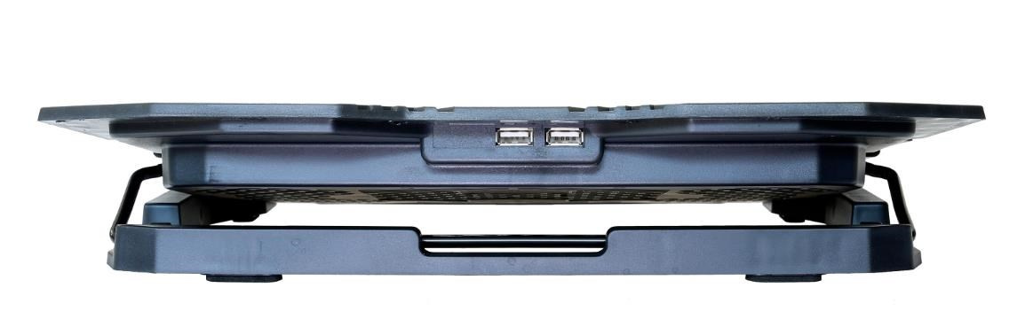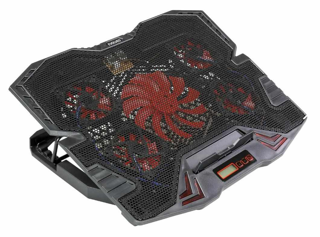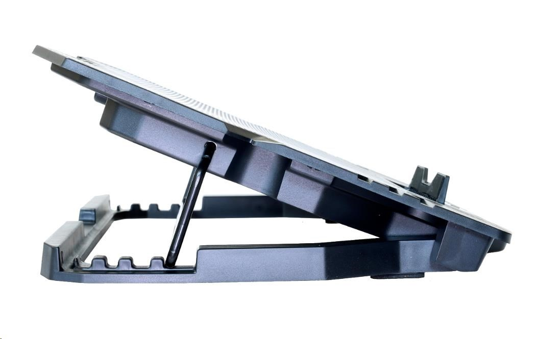 Herný nastaviteľný chladiaci stojan pre notebooky do veľkosti 15.6". 1x 120 mm a 4x 60 mm ventilátor. 2x USB 2.0. Regulácia otáčok ventilátora, displej.