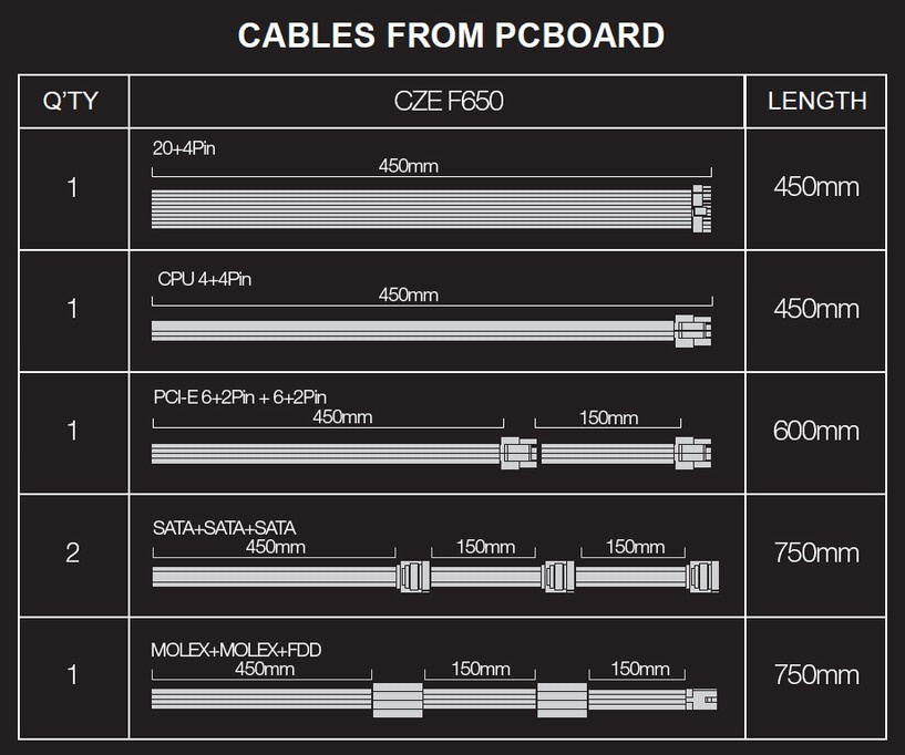 - PCI-E (6+2) +(6+2)pin (450+150 mm)