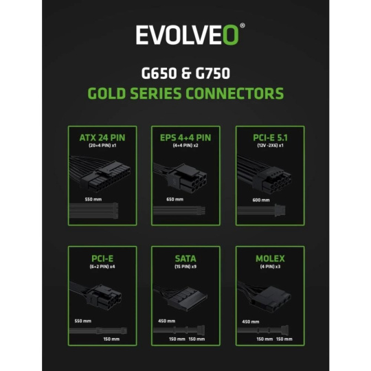 Zabudnite na zamotané kábly, ktoré bránia prúdeniu vzduchu a ešte kazia štýl vašej počítačovej skrine. Zdroj EVOLVEO G850-BK je plne modulárny, takže k nemu pripojíte len tie káble, ktoré naozaj potrebujete. Súčasťou balenia sú všetky dôležité šnúry – jeden kábel ATX 24 PIN, dva EPS 4+4 PIN, dva PCI-E 6+2 PIN, jeden PCI-E 5.1 12V-2×6, tri SATA a jeden MOLEX. Vďaka tomu máte miesto na všetko od CPU a GPU cez disky až po vymazlené LED pásy či iné extra prvky.