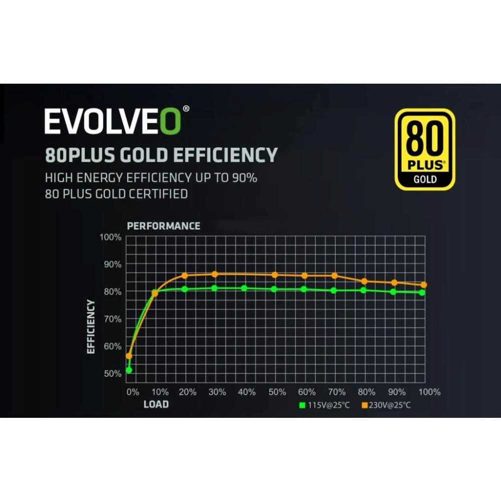 PC zdroj EVOLVEO G850-BK je hrdým držiteľom certifikácie 80 PLUS Gold, ktorá sľubuje až 92% účinnosti (pri bežnom 50% zaťažení). Minimálne straty energie a nízke zahrievanie idú ruka v ruke s tichým chodom 140mm HDB ventilátora – ten má medzi hriadeľom a ložiskami špeciálnu olejovú vrstvu a jeho trenie je zanedbateľné, takže hlučnosť zostáva na minime. S týmto zdrojom vás jednoducho neruší hučanie ventilátora – počuť len šušť kolies vašej formule alebo zvuk zbraní vašej armády.