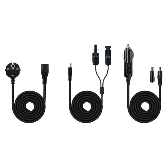 - Nabíjacie kábly v balení: 1× do zásuvky 230 V, 1× do auta a 1× pre solárny panel