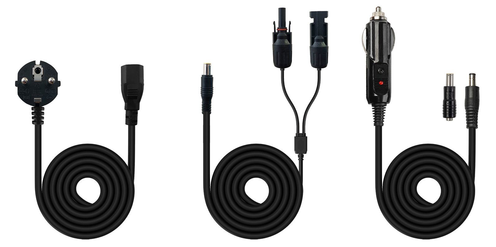 - Nabíjacie kábly v balení: 1× do zásuvky 230 V, 1× do auta a 1× pre solárny panel