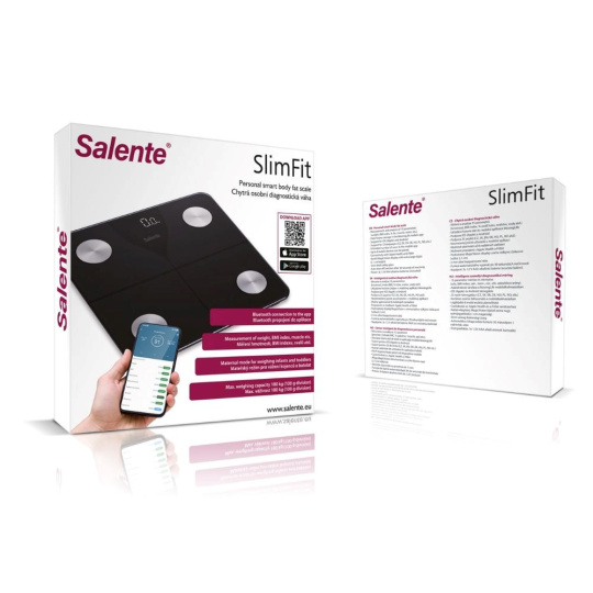 Inteligentná osobná diagnostická váha Salente SlimFit s prepojením do mobilnej aplikácie cez Bluetooth umožňuje prehľadne sledovať vývoj telesnej hmotnosti pri športe, diétach aj v bežnom živote. Váha meria a následne analyzuje 15 parametrov: