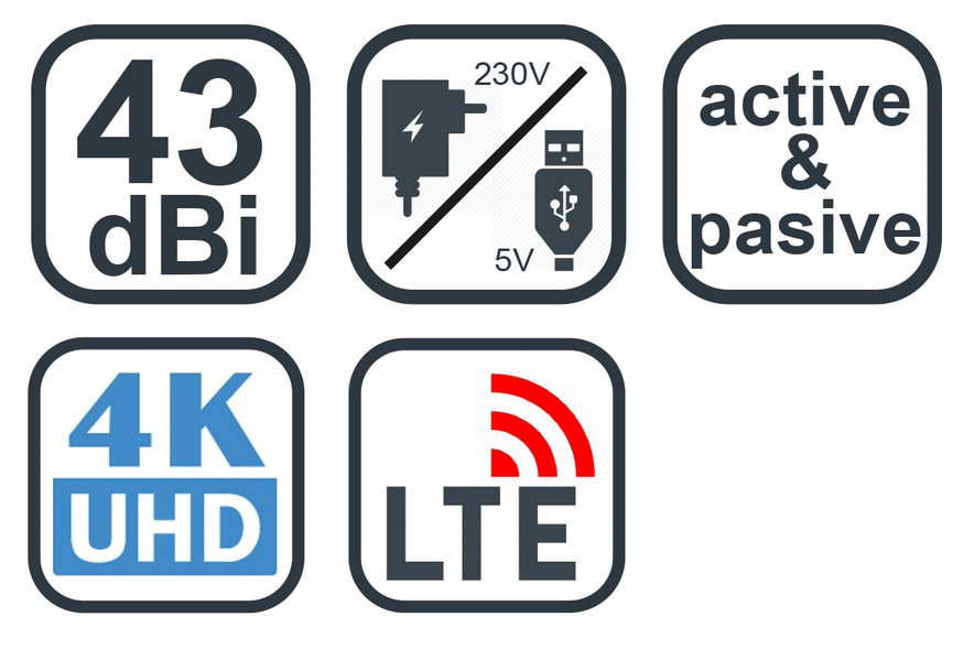 Elegantná vnútorná anténa na príjem digitálnej aj analógovej TV. Zosilňovač antény je možné napájať dvoma spôsobmi vďaka USB káblu. Napájanie pomocou adaptéra 230V a ďalej napájanie z USB konektora. Druhý spôsob ocení používateľ, ktorý chce sledovať TV napríklad na NB pomocou USB tunera. Anténu je možné prilepiť sadu 3M obojstranných pásikov na stenu, nábytok alebo umiestniť do podstavca.