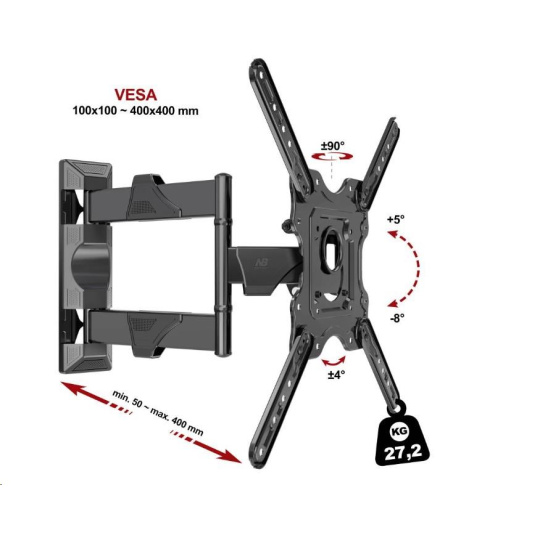 Kompletná špecifikácia Fiber Mounts DF400 - vynikajúci kĺbový držiak na televízory Nástenný držiak na LCD LED QLED plazmu TV 32-55", otočný do strán až +/-90°, naklápanie TV +5°/-8°, korekcia roviny +/-4°, vzdialenosť TV od steny 50-400mm, VESA 100x100 až 400x400, úchytky na káble, nosnosť 27,2kg Kvalitný držiak na TV vynikajúcej konštrukcie, ktorý je pevný, stabilný, veľmi bezpečný a ľahko nastaviteľný. Otáčanie do strán, náklon dolu aj nahor, zmena vzdialenosti od steny, korekcia roviny a inštalácia sú u tohoto držiaka hračkou, ktorú zvládne naozaj každý. A vďaka veľmi výhodnej cene si ho môže dovoliť naozaj každý. Teraz navyše vrátane dizajnových krytiek pre skryté vedenie káblov. Balenie obsahuje inštalačný materiál - hmoždinky, vruty, šrouby a distančné krúžky. Lacný televízny držiak vo špičkovej kvalite - ručíme za vašu spokojnosť - Fiber Mounts DF400 Technické údaje: nosnosť 27,2kg odporúčame na TV 32" až 55" podporuje VESA štandard 100x100 až 400x400 (nepodporuje VESA 400x300) otáčanie do strán +90° až -90° náklon +5° až -8° odsadenie od steny 50mm až 400mm korekcia roviny obrazovky +4° až -4° krytky na káble inštalačný materiál súčasťou balenia vynikajúca kvalita materiál oceľ farebné prevedenie čierne záruka 5 rokov