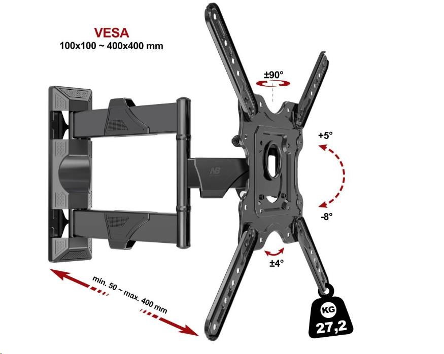 Kompletná špecifikácia Fiber Mounts DF400 - vynikajúci kĺbový držiak na televízory Nástenný držiak na LCD LED QLED plazmu TV 32-55", otočný do strán až +/-90°, naklápanie TV +5°/-8°, korekcia roviny +/-4°, vzdialenosť TV od steny 50-400mm, VESA 100x100 až 400x400, úchytky na káble, nosnosť 27,2kg Kvalitný držiak na TV vynikajúcej konštrukcie, ktorý je pevný, stabilný, veľmi bezpečný a ľahko nastaviteľný. Otáčanie do strán, náklon dolu aj nahor, zmena vzdialenosti od steny, korekcia roviny a inštalácia sú u tohoto držiaka hračkou, ktorú zvládne naozaj každý. A vďaka veľmi výhodnej cene si ho môže dovoliť naozaj každý. Teraz navyše vrátane dizajnových krytiek pre skryté vedenie káblov. Balenie obsahuje inštalačný materiál - hmoždinky, vruty, šrouby a distančné krúžky. Lacný televízny držiak vo špičkovej kvalite - ručíme za vašu spokojnosť - Fiber Mounts DF400 Technické údaje: nosnosť 27,2kg odporúčame na TV 32" až 55" podporuje VESA štandard 100x100 až 400x400 (nepodporuje VESA 400x300) otáčanie do strán +90° až -90° náklon +5° až -8° odsadenie od steny 50mm až 400mm korekcia roviny obrazovky +4° až -4° krytky na káble inštalačný materiál súčasťou balenia vynikajúca kvalita materiál oceľ farebné prevedenie čierne záruka 5 rokov