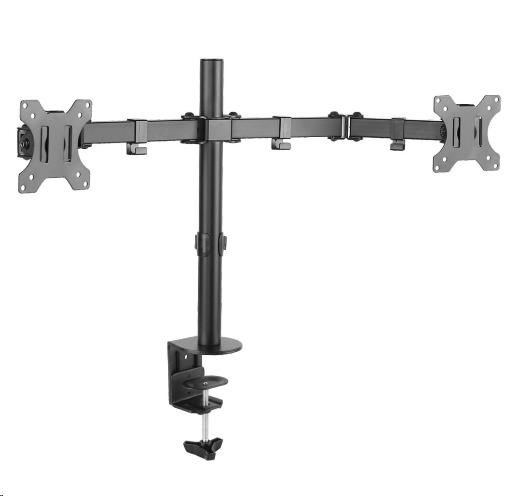 Fiber Mounts M7C54 - kancelársky držiak na 2 LCD monitory Kvalitný deskový držiak na 2 monitory 13-32", otáčanie do strán, náklon, nastavenie výšky a vzdialenosti Univerzálny držiak na zavesenie 2 obrazoviek vedľa seba, nezávislé nastavenie polohy jednotlivých monitorov, VESA štandard, nosnosť 16kg. Úchytky na zafixovanie káblov. Súčasťou balenia sú 2 typy ukotvenia na stolovú dosku. Držiak je vďaka svojej vynikajúcej kvalite a veľmi priaznivej cene často vyhľadávaný. Technické údaje: celková nosnosť 16kg maximálna hmotnosť 1 monitoru 8kg podpora VESA štandardu 75x75 a 100x100 za príplatok možnosť rozšírenia na 200x100 alebo 200x200 odporúčaná uhlopriečka monitoru alebo televízora 13-32" otáčanie do strán +/- 180° náklon +/- 45° celková výška 443mm nastavenie výšky monitoru podľa potreby úchytky na zafixovanie kábľov kvalitná bezpečná konštrukcia materiál oceľ farba čierna záruka 3 roky Kancelársky držiak na 2 monitory M7C54 podporuje VESA štandardy: VESA 75x75 VESA 100x100