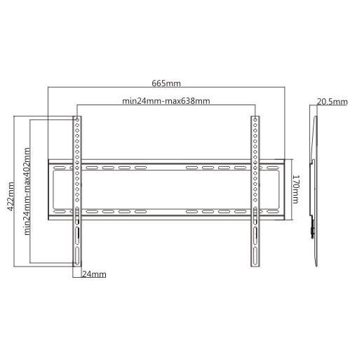 Nástenný držiak na televíziu a monitory Fiber FM02 Poctivý oceľový držiak na TV 37-70", vzdialenosť TV od steny 20mm, podpora VESA 100x100 až 600x400, nosnosť 35kg Kvalitný oceľový držiak na zavedenie televízorov alebo monitorov s uhlopriečkou 37" až 70" na stenu. Vzdialenosť TV od steny len 20,5mm, podpora VESA štandardov 100x100 až 600x400, nosnosť 35kg. Držiak je dodávaný vrátane inštalačného materiálu. Inštalačná nástenná doska s rozmermi 650x170mm zabezpečí vynikajúce rozloženie hmotnosti na veľkej ploche. Záruka 10 rokov. Fixný poctivý držiak na televízie a monitory 37-70" Fiber FM02 Technické údaje: nosnosť 35kg podpora VESA štandardov 100x100 až 600x400 na televízie a monitory s uhlopriečkou 37" až 70" vzdialenosť od steny 20,5mm snadná montáž oceliová konštrukcia inštalačný materiál (hmoždinky, vruty, sada skrutiek) farba čierna záruka 10 rokov Zabezpečenie televízie na držiaku pomocou skrutiek integrovaných do ramien držiaku Fiber FM02 Držiak TV FM02 podporuje VESA štandardy: VESA 100x100 VESA 200x100 a 100x200 VESA 200x200 VESA 300x200 a 200x300 VESA 300x300 VESA 400x200 a 200x400 VESA 400x300 a 300x400 VESA 400x400 VESA 600x400 Na držiaky Fiber FM02 je možné zavrieť všetky typy a značky TV aj monitorov, ktoré: majú hmotnosť maximálne 35kg podporujú ktorýkoľvek z vyššie uvedených VESA štandardov