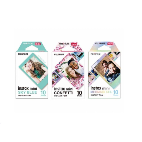 Exkluzívne balenie filmov Instax Mini. Každý zo štyroch balíčkov nesie jedinečný dizajn rámčeka, čo vám dáva možnosť vytvoriť fotografie, ktoré nielen zachytávajú okamihy, ale aj rozprávajú svoj vlastný príbeh plný kreativity a osobného výrazu. Užívajte si okamžité tlače s Instax Mini a urobte svoje spomienky ešte výnimočnejšími.  Balenie zahŕňa tri odlišné dizajny okrajov: CONFETTI pre veselé okamihy, SKY BLUE, ak chcete vyjadriť pozitívnu náladu a harmóniu, a dúhový okraj MERMAID TAIL pre nádych kúzla a fantázie.