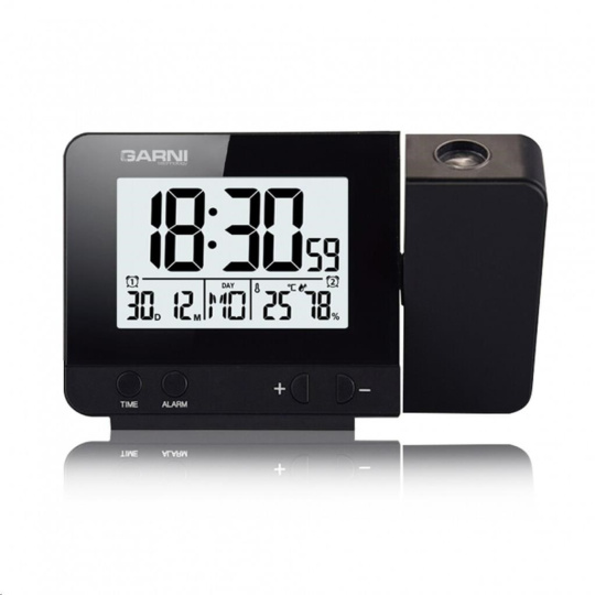 Digitálny budík s projekciou času a vnútornej teploty s LCD displejom, časom riadeným rádiovým signálom DCF-77 a meraním vnútornej teploty a relatívnej vlhkosti LCD displej o rozmere 63 x 42 mm s možnosťou stálého osvetlenia pri napájaní sieťovým adaptérom, alebo krátkodobým osvetlením na 8 s pri napájaní batériami 3 stupne jasu osvetlenia displeja, možnosť vypnutia osvetlenia displeja (pri napájaní sieťovým adaptérom) veľkosť číslic na displeji – čas 25 mm, dátum, skratka názvu dňa, vnútorná teplota a rel. vlhkosť 8,5 mm čas a dátum riadené signálom DCF-77 s možnosťou manuálneho nastavenia ikona príjmu signálu DCF-77 skratka názvu dňa 12-hodinový alebo 24-hodinový formát zobrazenia času možnosť nastavenia časového pásma od -12 do +12 hodín budík s 2 budícími časmi s funkciou opakovaného bdenia (Snooze) po 5 minútach budící signál - 10 sekúnd 1 pípnutie za sekundu, 10 sekúnd 2 pípnutia za sekundu, 10 sekúnd 4 pípnutia za sekundu a potom stály pípací zvuk projekcia času a vnútornej teploty s možnosťou otočenia obrazu o 180°, možnosť sklopenia tubusu projektora o 90° dopredu a dozadu farba projekcie červená stále projekcie pri napájaní sieťovým adaptérom s možnosťou vypnutia zobrazenie hodnôt vnútornej teploty a relatívnej vlhkosti zobrazenie teploty vo °C, alebo °F USB port na nabíjanie mobilných zariadení (len pri napájaní hlavnej jednotky sieťovým adaptérom), maximálny nabíjací prúd 1 000 mA napájanie sieťovým adaptérom, alebo batériami možnosť postavenia farba čierna Obsah balenia: 1 x digitálny budík GARNI 140 1 x sieťový adaptér český, slovenský, nemecký, anglický, taliansky, poľský a maďarský návod