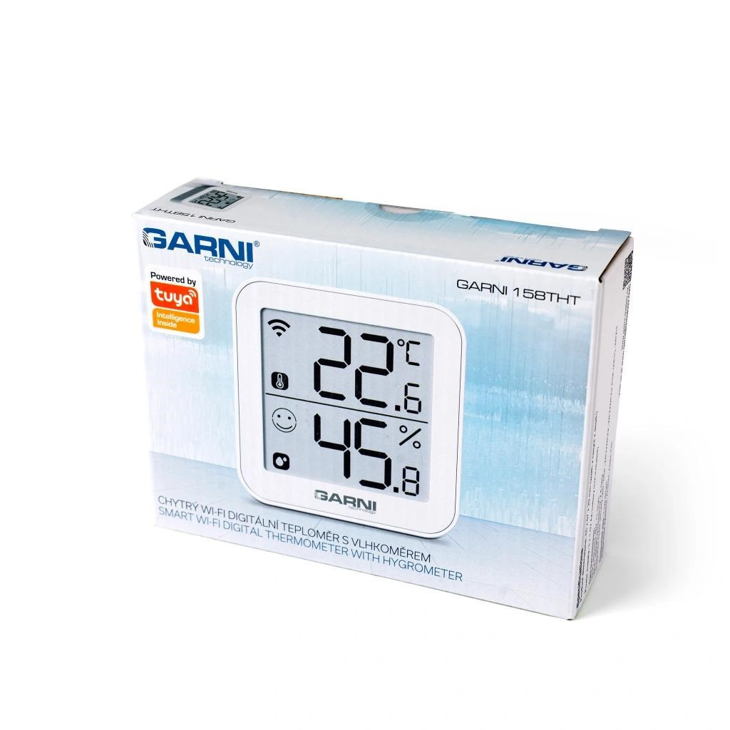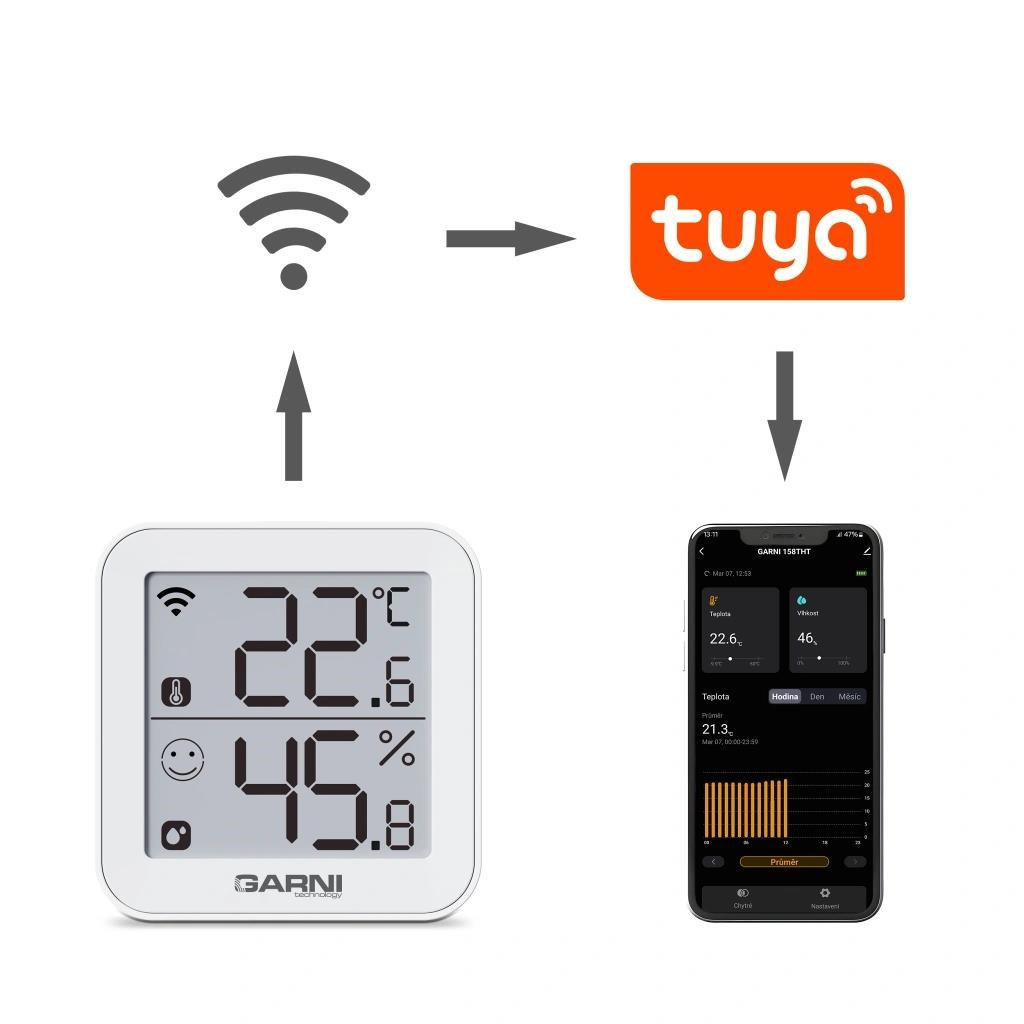 Chytrý vnútorný digitálny teplomer s vlhkomerom model GARNI 158THT má zabudovaný Wi-Fi modula prostredníctvom svojho chytrého systému je kompatibilný s platformou Tuya IOT. Pomocou aplikácie Tuya Smart môžete sledovať vnútornú teplotu a relatívnu vlhkosť, prehliadať históriu záznamov, nastavovať alarmy pre dané veličiny, spúšťať pokročilé funkcie za pomoci nameraných hodnôt a odoslať namerané údaje na email v Excel súbore. Je možné ho prepojiť s ďalšími produktmi chytré domácnosti, ovládanie potom prebieha cez aplikáciu v mobilnom zariadení. Podporuje integráciu do Google Assistant a Alexa.