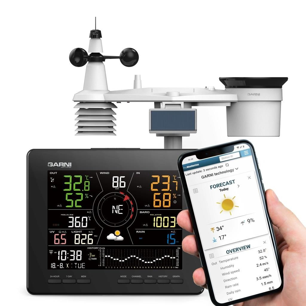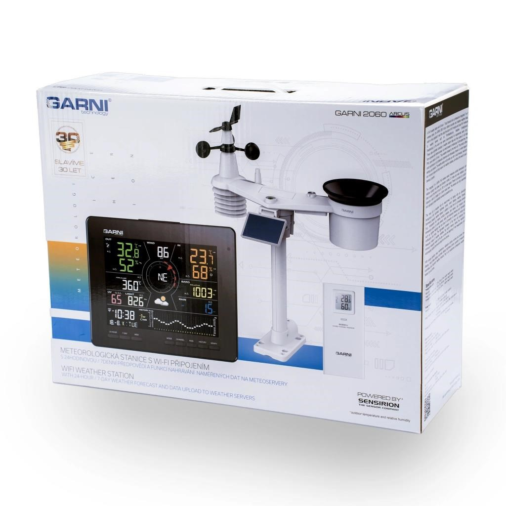 Meteorologická stanica s Wi-Fi, 24hodinovou / 7-dňovou predpoveďou a profesionálnym integrovaným bezdrôtovým senzorom 7-v-1 so solárnym panelom a vestaveným kapacitorom, model GARNI 2060 Arcus, zhromažďuje presné a podrobné údaje o počasí, ktoré sú potom v reálnom čase odosielané pomocou vestaveného Wi-Fi modulu a miestnej siete Wi-Fi na meteorologické servery a aplikácie, ako sú ProWeatherLive, Weather Underground, Weathercloud, Počasí Meteo alebo vlastný server používateľa (odporúča sa iba pre skúsených používateľov). Tieto umožňujú automatické nahrávanie dát meteorologickej stanice a voľný prístup ku všetkým údajom odkiaľkoľvek s prístupom na internet, cez webový prehliadač alebo mobilnú aplikáciu. Zároveň ProWeatherLive (PWL) server posiela 24hodinovú / 7-dňovú predpoveď počasia do hlavnej jednotky. Výrobok ponúka solidný výkon všetkým profesionálnym pozorovateľom a nadšencom vďaka širokej škále nastavení a senzorov. Meteorologická stanica vám poskytne lokálnu predpoveď, maximálne a minimálne hodnoty a celkové hodnoty všetkých meteorologických premenných, to všetko bez nutnosti použitia stolného počítača.