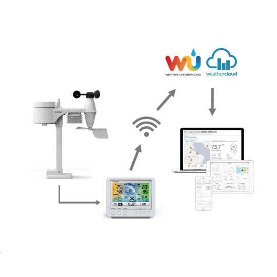 - vodotesné integrované bezdrôtové čidlo 5 v 1 (teplota, relatívna vlhkosť, rýchlosť vetra, smer vetra, dažďové srážky)