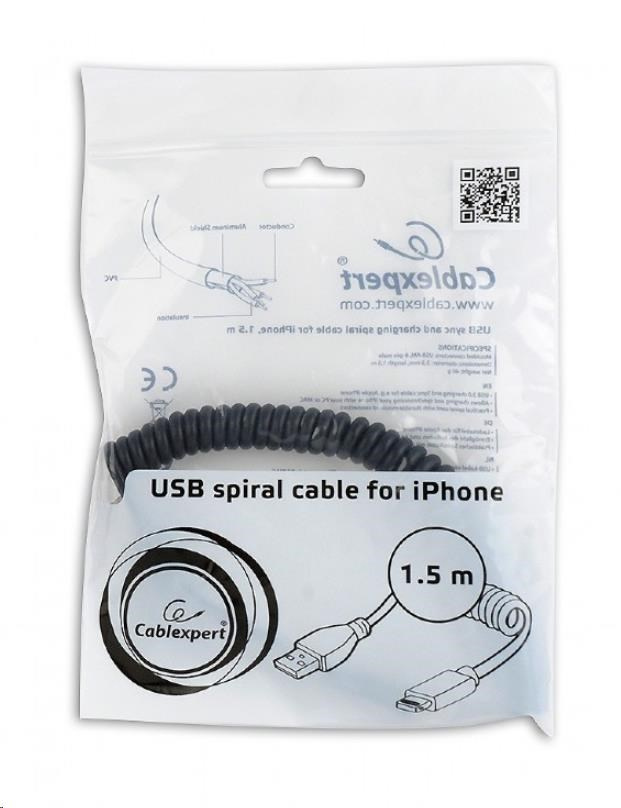 Synchronizačný a nabíjací špirálový kábel USB pre iPhone, 1.5 m, čierna