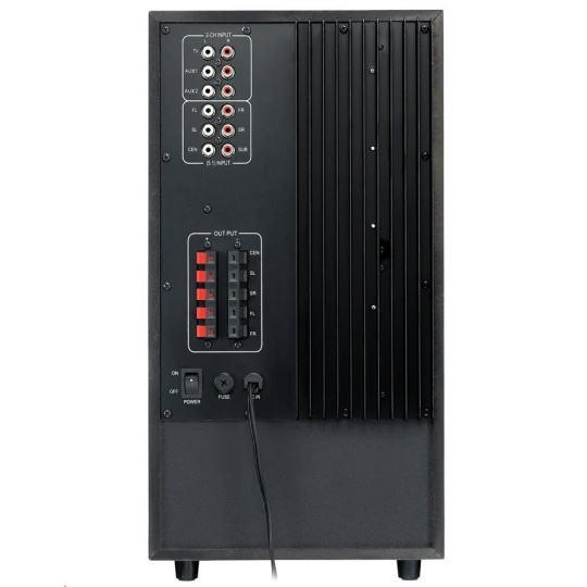 Reproduktorový systém v konfigurácii 5.1 ponúka celkový výkon 200 W. Zostava s drevenou povrchovou úpravou sa skladá z kvalitného subwoofera s 8" reproduktorom, ktorý má integrovaný zosilňovač a výkon 75 W. Subwoofer dopĺňajú štyri satelity a jeden stredový reproduktor s výkonom 4 x 24 W + 1 x 30 W. Balenie obsahuje napájací adaptér 100-240 V a diaľkové ovládanie.