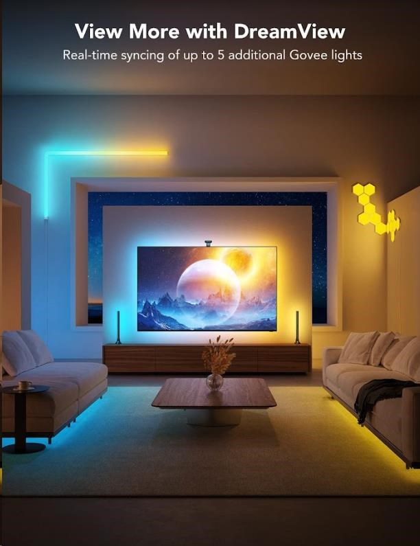 Špeciálna duálna kamera s pokročilou technológiou ColorMatch inteligentne rozoznáva a zachytáva farby na obrazovke vašej televízie alebo monitora. Na základe tejto farebnej analýzy automaticky vyhodnotí a nastaví ideálne podsvietenie. Užívajte si synchronizáciu farieb bez oneskorenia, bez potreby HDMI kábla alebo obmedzení streamovacími službami. Spolu možno spárovať až päť Govee zariadení.